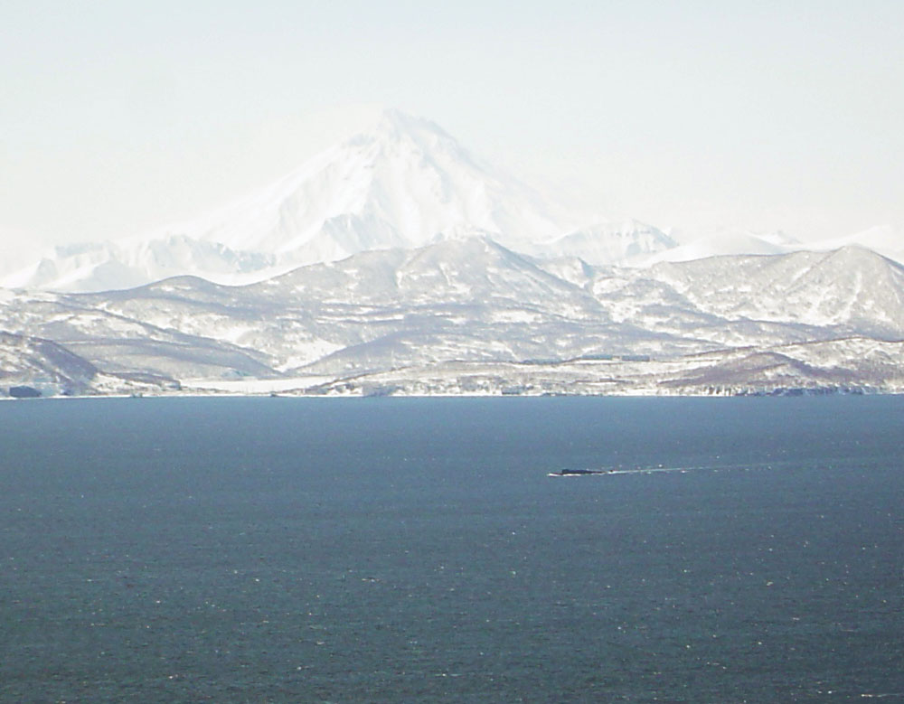 A submarine surfaces in the bay in front of the Koryaksky volcano.
